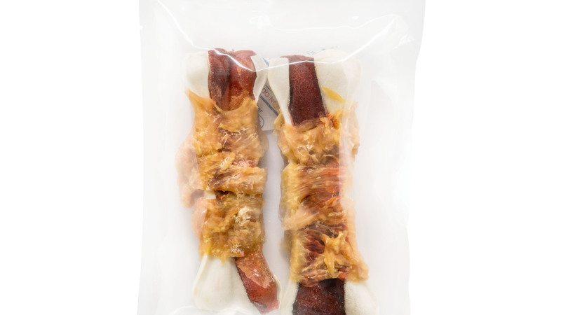 Samenstelling: onderhuids bindweefsel van runderhuid (verbinding tussen huid en dier) geweekt in waterstofperoxide, omwikkeld met kipfilet